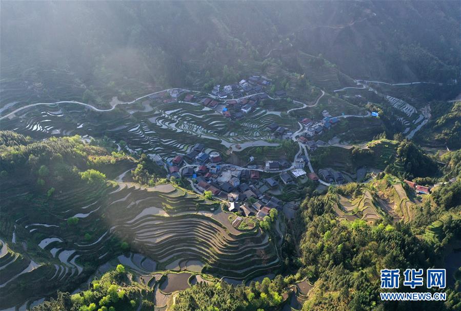 這是融水苗族自治縣桿洞鄉(xiāng)小河村高羽苗寨的木樓和梯田(3月31日攝,無人機(jī)照片)。新華社記者黃孝邦攝
