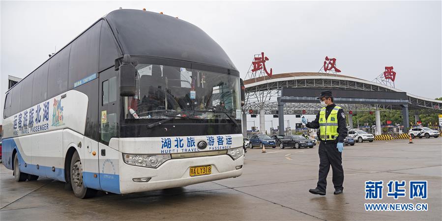3月24日,在武漢西高速收費站交通卡點,執(zhí)勤民警陳鋼示意載有復(fù)工復(fù)產(chǎn)人員的大巴通行。新華社記者才揚攝