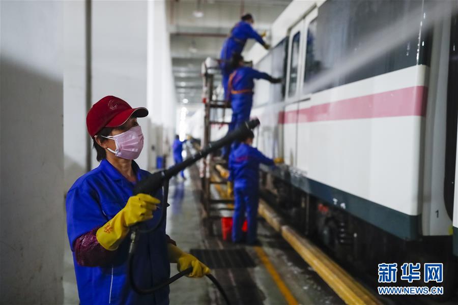 3月23日,在武漢地鐵常青車輛段,保潔人員在為地鐵列車消毒。新華社記者肖藝九攝