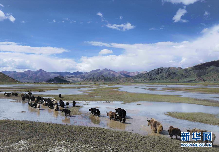 一群牦牛走過藏北濕地(2018年9月7日攝)。新華社記者普布扎西攝