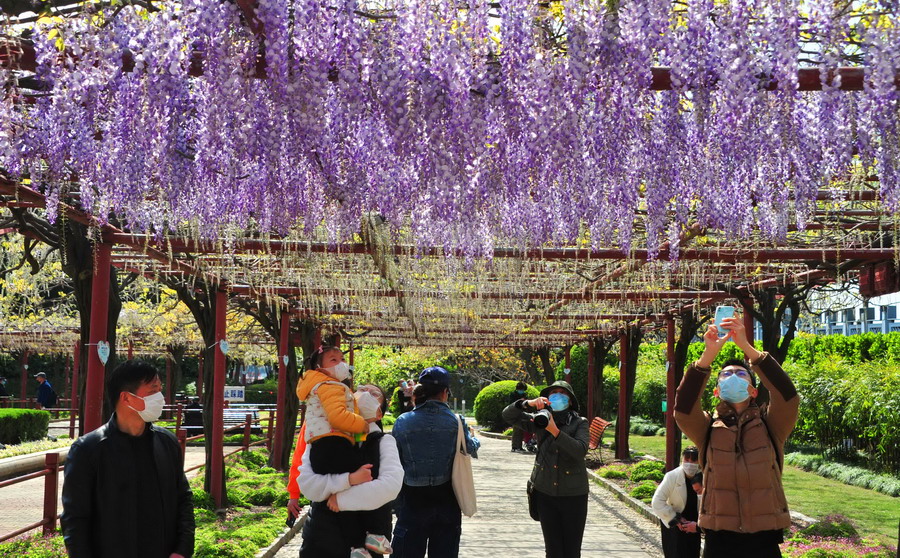 2020年4月5日,上海,每年的4月上旬至5月初是觀賞紫藤花的最佳時期。清明小長假里,晴好天氣使嘉定紫藤園迎來了不少市民游客。今年的紫藤公園采取提前預(yù)約和亮相綠色隨申碼的舉措入園賞花。公園擁有26個品種的紫藤花,盛開時期的紫藤花穗最長可達(dá)1米多。花色有紫,粉,白等,形成的花瀑宛若一簾幽夢,雅致春意今人流連忘返。