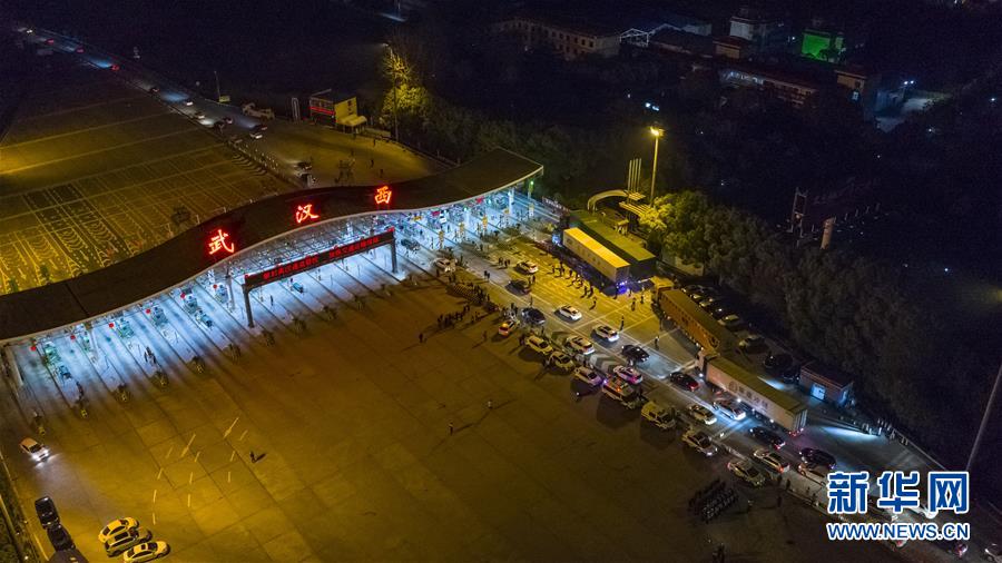 4月8日凌晨,車輛通過武漢西高速收費站(無人機(jī)拍攝)。 新華社記者 沈伯韓 攝