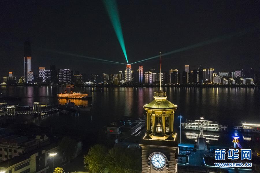 這是4月7日晚拍攝的武漢市江漢關博物館及長江對岸建筑燈光夜景(無人機拍攝)。新華社記者沈伯韓攝