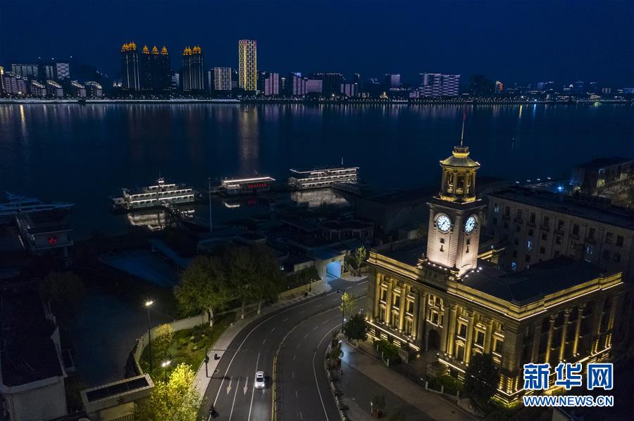 這是4月7日晚拍攝的武漢市江漢關(guān)博物館及長江對岸建筑燈光夜景(無人機(jī)拍攝)。4月8日零時起,武漢市正式解除離漢離鄂通道管控措施。新華社記者沈伯韓攝
