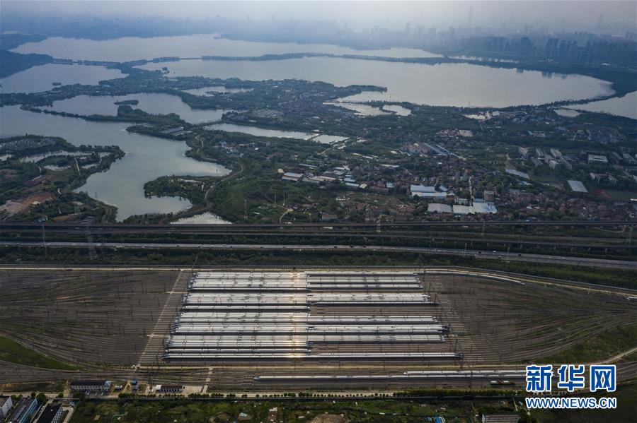 4月7日,在武漢動(dòng)車段,列車停靠在存車線上(無人機(jī)照片)。