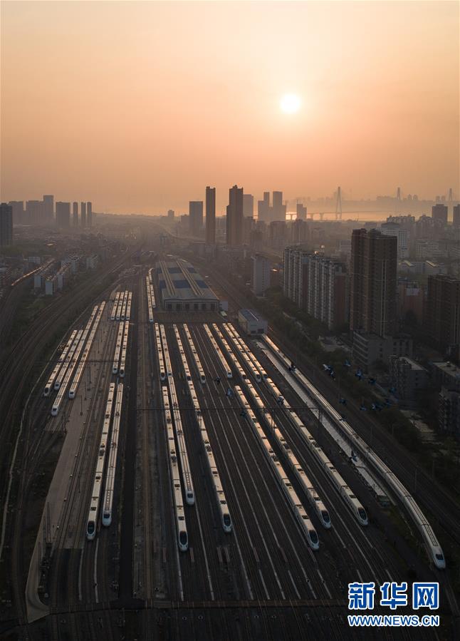 4月8日,在武漢動車段,列車??吭诖孳嚲€上準(zhǔn)備投入運(yùn)行(無人機(jī)照片)。當(dāng)日,武漢市正式解除離漢離鄂通道管控措施,幾十組在武漢動車段經(jīng)過檢修消殺的動車組,猶如“陸地艦隊(duì)”??吭诖孳嚲€上,蓄勢待發(fā),重新啟程。 新華社記者 肖藝九 攝
