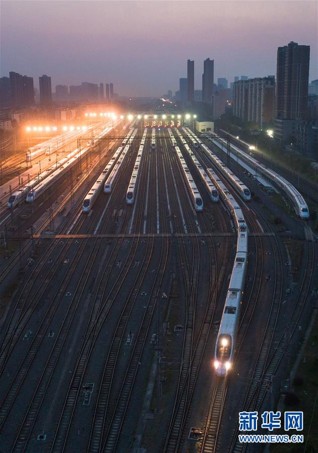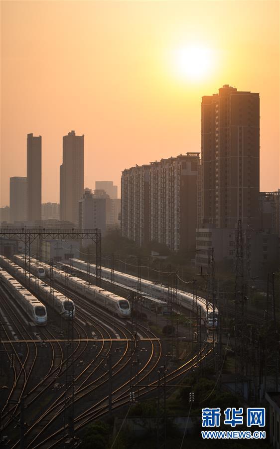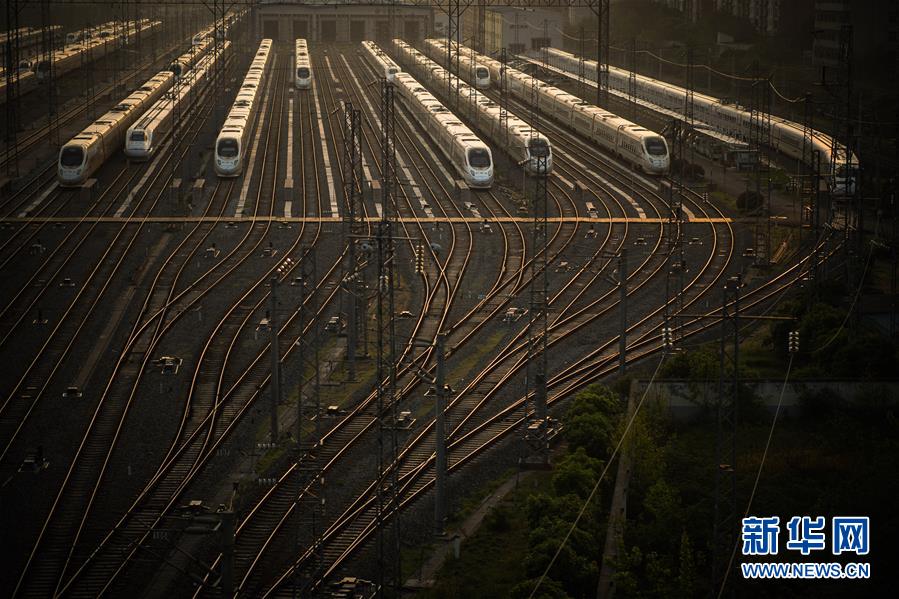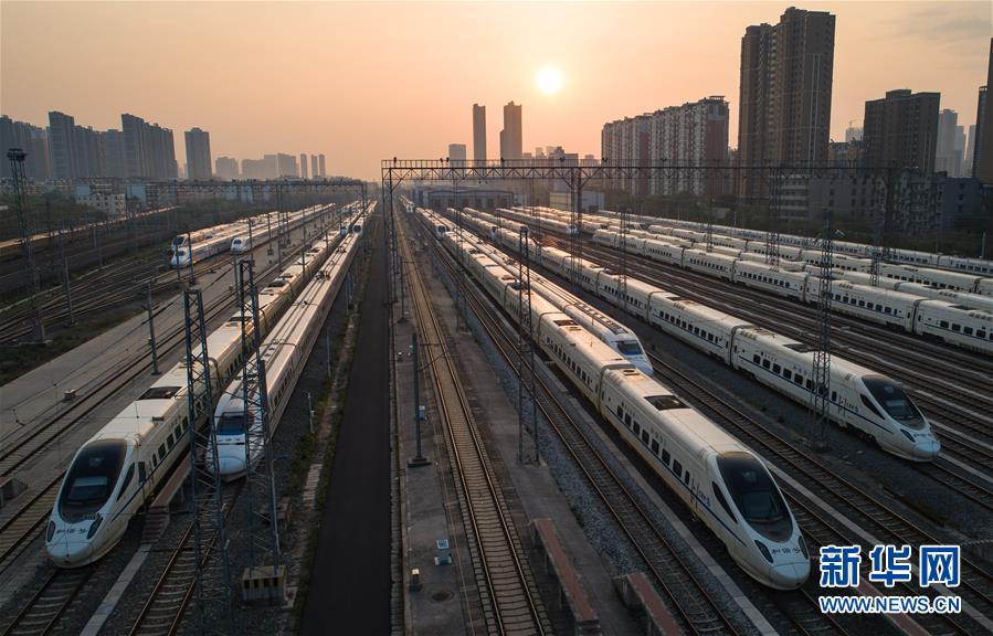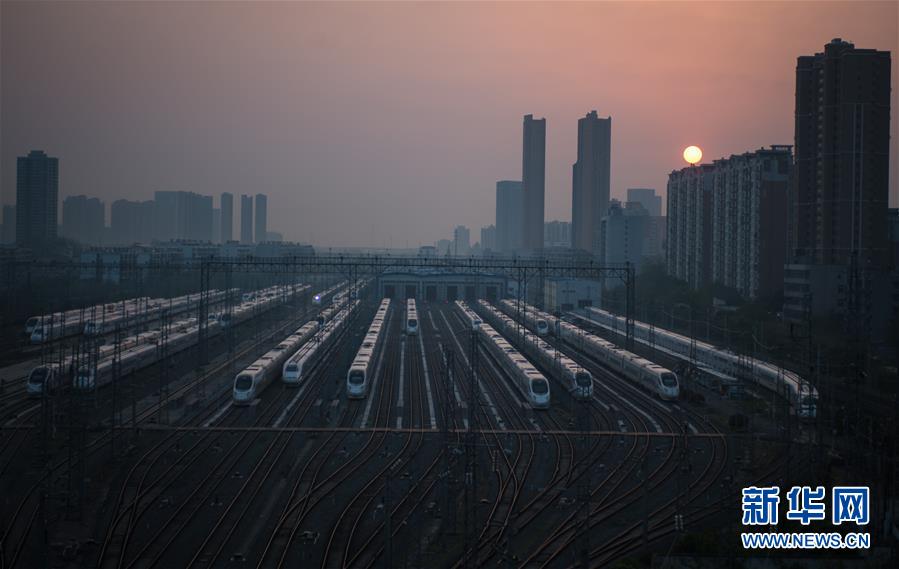 4月8日,在武漢動車段,列車停靠在存車線上準(zhǔn)備投入運(yùn)行。 新華社記者 肖藝九 攝