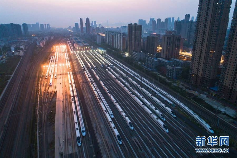 4月8日,在武漢動車段,列車??吭诖孳嚲€上準(zhǔn)備投入運(yùn)行(無人機(jī)照片)。 新華社記者 肖藝九 攝