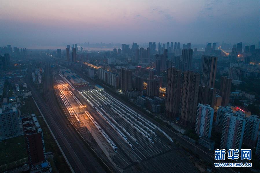 4月8日,在武漢動車段,列車停靠在存車線上準備投入運行(無人機照片)。 新華社記者 肖藝九 攝