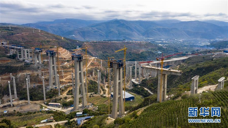 這是3月5日拍攝的中老鐵路南溪河特大橋橫跨在建高速公路(無人機照片)。新華社記者江文耀攝