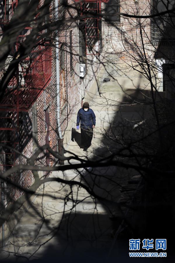 4月1日,在美國(guó)紐約,居民在一處住宅樓的院子里散步。新華社記者王迎攝