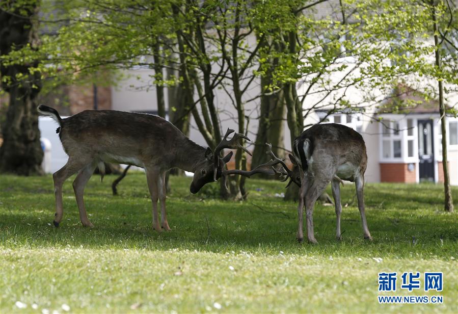 4月8日,在英國倫敦東部一個居民區(qū),附近公園里的鹿在草坪上吃草。隨著新冠疫情在英國的擴(kuò)散,政府要求人們減少不必要的外出。倫敦東部一個居民區(qū)附近公園里原來散養(yǎng)的鹿紛紛從公園走出來,或吃草或接受附近居民的喂食,成為特殊時期居民區(qū)里的新“客人”。新華社記者韓巖攝