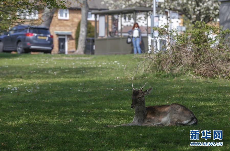 4月8日,在英國倫敦東部一個居民區(qū),附近公園里的鹿在草坪上休息。隨著新冠疫情在英國的擴(kuò)散,政府要求人們減少不必要的外出。倫敦東部一個居民區(qū)附近公園里原來散養(yǎng)的鹿紛紛從公園走出來,或吃草或接受附近居民的喂食,成為特殊時期居民區(qū)里的新“客人”。新華社記者韓巖攝