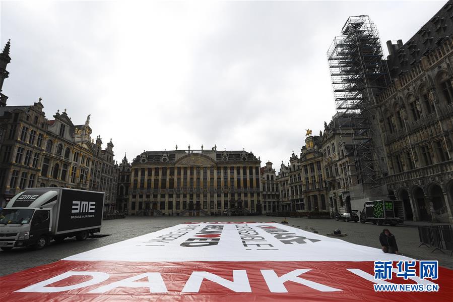 這是4月13日在比利時布魯塞爾大廣場拍攝的為抗擊疫情加油的巨幅海報。當日,比利時布魯塞爾市政府工作人員在市中心的大廣場展開一面巨幅海報,上面用法語和荷蘭語印著“一起鼓起勇氣”“謝謝”,以感謝市民及醫(yī)療人員為抗擊疫情所做的努力。新華社記者鄭煥松攝