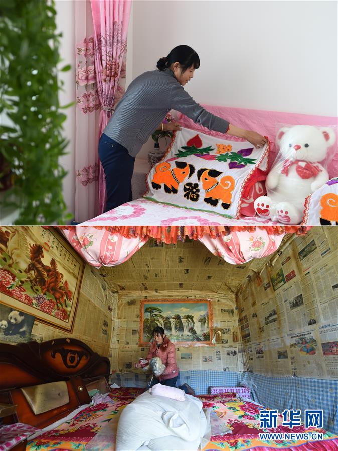 拼版照片:上圖為胥存在古浪縣綠洲生態(tài)移民小城鎮(zhèn)整理家中臥室(4月7日攝);下圖為胥存在古浪縣黃羊川鎮(zhèn)石城村收拾家中床上物品(2018年2月6日攝)。新華社記者范培珅攝