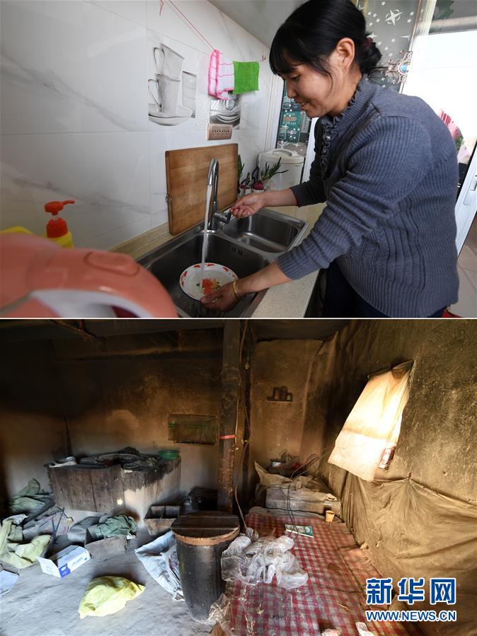 拼版照片:上圖為胥存在古浪縣綠洲生態(tài)移民小城鎮(zhèn)的家中廚房忙碌(4月7日攝);下圖為胥存在古浪縣黃羊川鎮(zhèn)石城村的家中廚房(2018年2月6日攝)。新華社記者范培珅攝