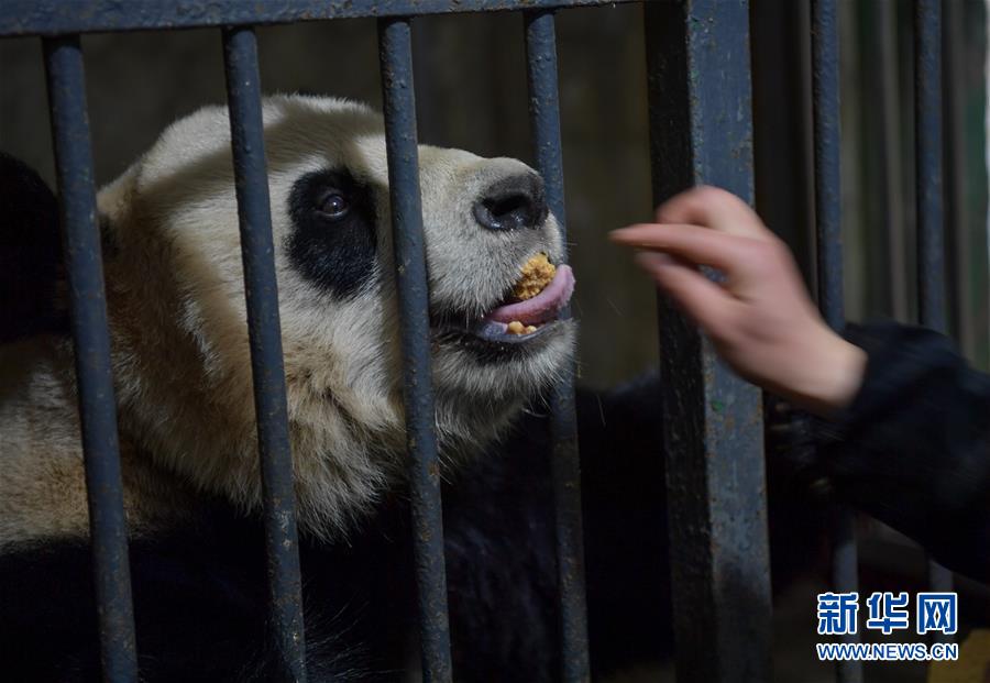 4月14日,中國大熊貓保護(hù)研究中心核桃坪基地飼養(yǎng)員周季秋用投喂窩窩頭的方法訓(xùn)練大熊貓“喜妹”。新華社記者張超群攝
