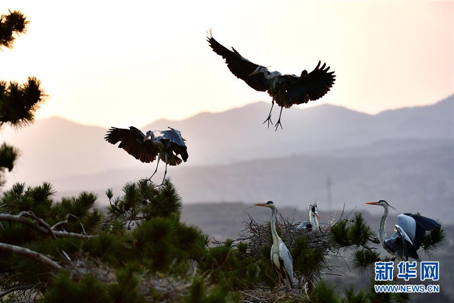春日,大批蒼鷺在山西省呂梁市方山縣積翠鄉(xiāng)的樹林之中飛舞嬉戲,構(gòu)成一幅幅和諧生態(tài)畫卷。新華社發(fā)(劉亮亮攝)