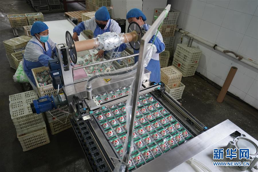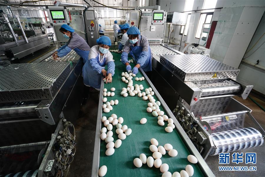 江蘇高郵鴨集團(tuán)的工作人員將塑封好的鴨蛋產(chǎn)品進(jìn)行進(jìn)一步加工作業(yè)(4月15日攝)?!案哙]鴨蛋”是江蘇高郵的特色農(nóng)業(yè)名片。近年來(lái),當(dāng)?shù)卦诹挤N繁育、生態(tài)養(yǎng)殖、產(chǎn)品加工等方面加大力度,推動(dòng)高郵鴨蛋品牌化建設(shè),讓小鴨蛋成為帶動(dòng)農(nóng)戶致富的大產(chǎn)業(yè)。2019年,高郵市共計(jì)生產(chǎn)熟制鴨蛋產(chǎn)品近11.2億枚,年產(chǎn)值近17.68億元。新華社記者李博攝