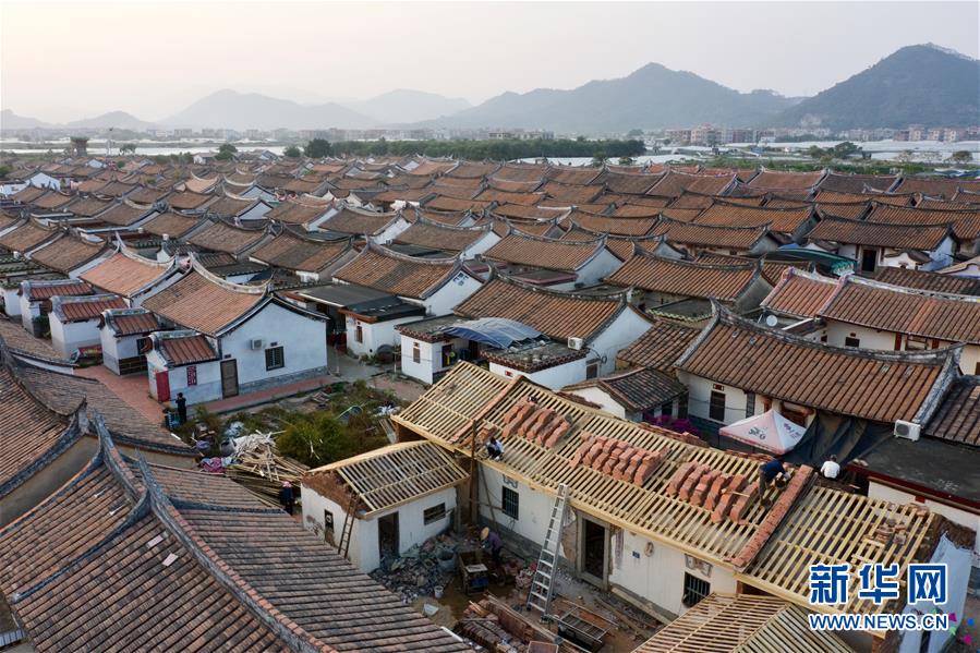 11月14日,埭美村村民在修繕一座古民居(無(wú)人機(jī)拍攝)。新華社記者姜克紅攝