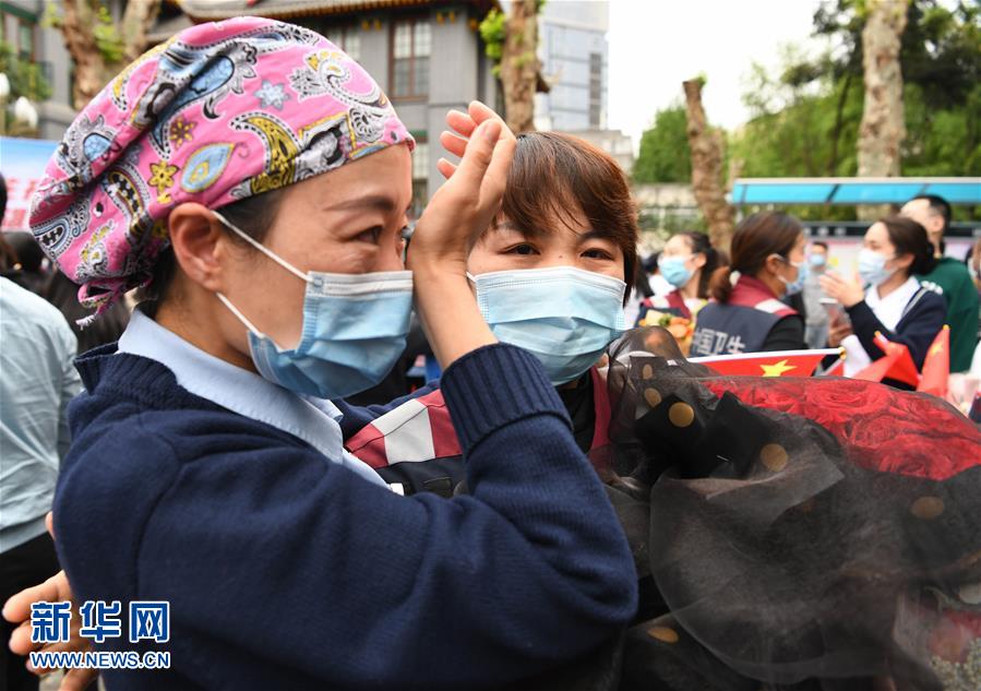 4月21日,在四川大學(xué)華西醫(yī)院,醫(yī)療隊(duì)隊(duì)員安慰流淚的同事。當(dāng)日,來自四川大學(xué)華西醫(yī)院、華西第二醫(yī)院、華西第四醫(yī)院的醫(yī)療隊(duì)隊(duì)員解除隔離休整,與分別許久的家人、同事團(tuán)聚,緊緊相擁。新華社記者王曦?cái)z