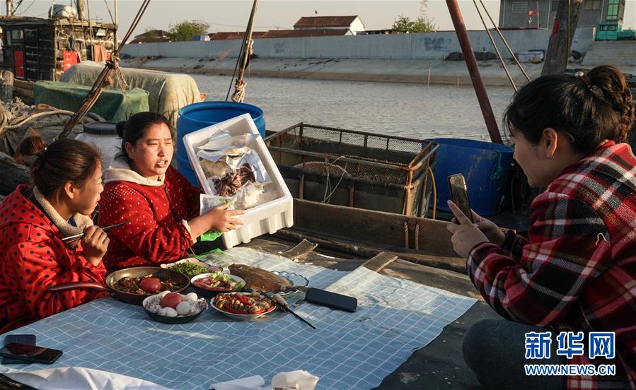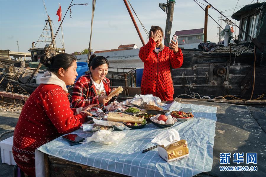4月22日,馬花雨(下右)、徐紅紅(上)、陸倩(下左)在漁船上拍攝推銷海產(chǎn)品的短視頻。近年來(lái),江蘇省連云港市贛榆區(qū)海頭鎮(zhèn)越來(lái)越多的居民開始直播銷售海產(chǎn)品,當(dāng)?shù)貪O船、碼頭和市場(chǎng)上活躍著一批網(wǎng)絡(luò)直播好手。目前,全鎮(zhèn)有3000多戶商家從事海產(chǎn)品直播銷售業(yè)務(wù),形成了集捕撈、加工、包裝、銷售和物流于一體的電商產(chǎn)業(yè)鏈。新華社記者楊磊攝