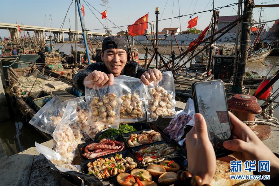 4月22日,31歲的顧峻豪(左)在朱蓬口漁港拍攝短視頻推銷海產(chǎn)品。他從去年9月起開始做網(wǎng)絡(luò)主播銷售海產(chǎn)品,目前已有12萬(wàn)粉絲。新華社記者楊磊攝