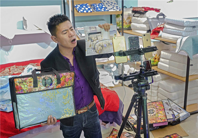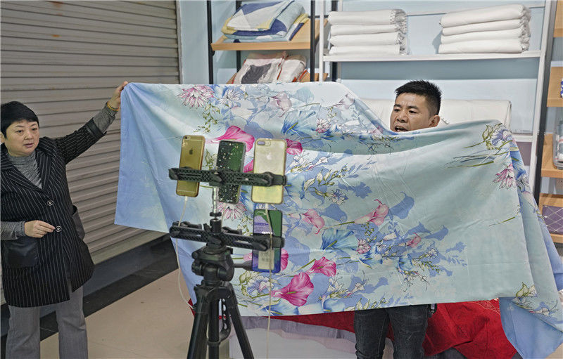 2019年11月10日,江金華,義烏北下朱村,在店鋪里直播銷售床上用品的兩個(gè)店員。