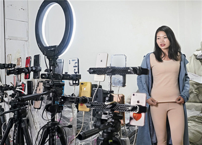 2019年11月9日,浙江金華,義烏北下朱村,女主播在直播銷售保暖內(nèi)衣。