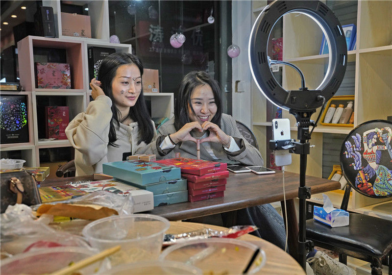 2019年11月10日,浙江金華,義烏北下朱村,倆主播在銷(xiāo)售化妝品,一個(gè)主播做出愛(ài)心的手型,對(duì)她們的“老鐵”(粉絲)示好。
