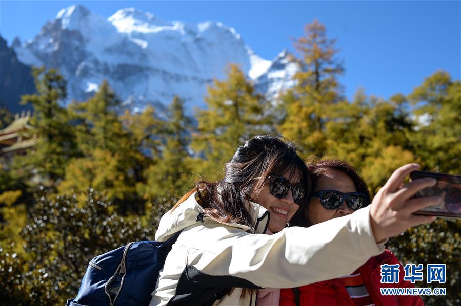 游客在亞丁景區(qū)內拍照合影(2019年10月20日攝)。新華社記者唐文豪攝