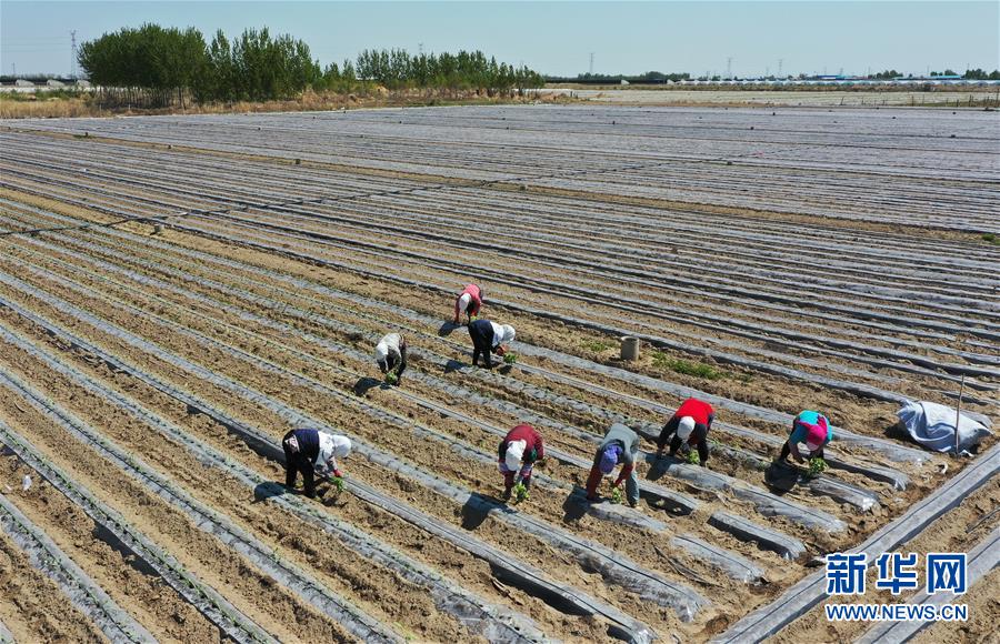 4月25日,灤南縣東黃坨鎮(zhèn)新戶村農(nóng)民在田間栽植煙薯秧苗(無人機照片)。近年來,河北省灤南縣利用當(dāng)?shù)赝寥篮蜌夂蛱攸c,引導(dǎo)農(nóng)民因地制宜發(fā)展煙薯種植,取得良好效果。目前該縣煙薯種植面積達3萬多畝,每畝年收入達5000多元。新華社記者楊世堯攝