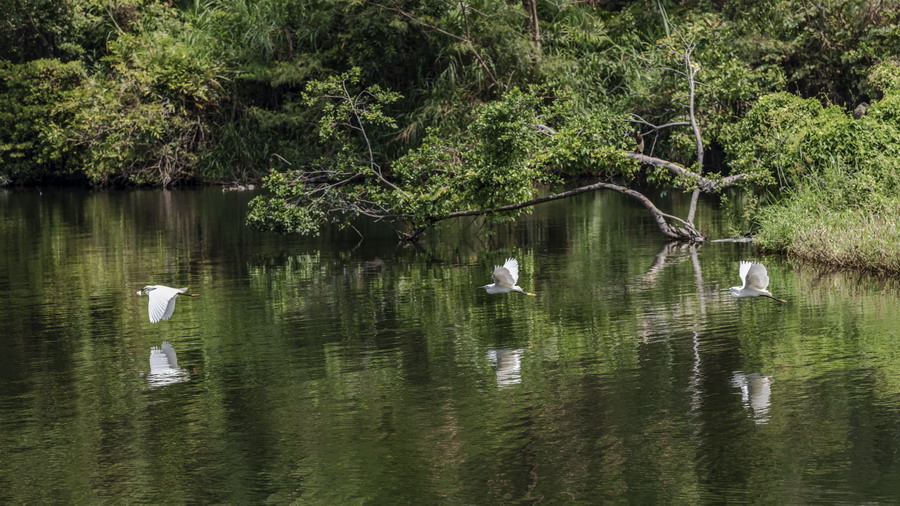 4月15日,攝于南山區(qū)華僑城天鵝堡附近。這是深圳拍鷺鳥的其中一個(gè)好去處。左一白鷺捕到食物,后方兩只白鷺追趕。徐捷