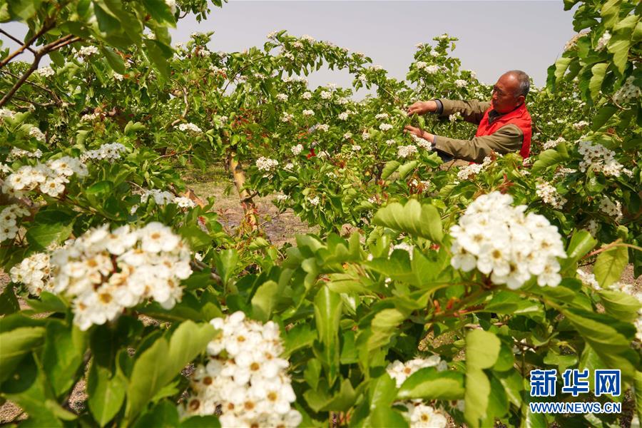 4月26日,農(nóng)民在河北省清河縣馬屯紅果種植專業(yè)合作社的山楂種植區(qū)內(nèi)為果樹疏花。4月下旬以來,河北省清河縣2萬(wàn)余畝山楂樹競(jìng)相開花,成為一道亮麗的風(fēng)景線。清河縣年產(chǎn)山楂7.5萬(wàn)余噸,山楂種植已成為當(dāng)?shù)剞r(nóng)民的重要增收途徑。新華社記者牟宇攝