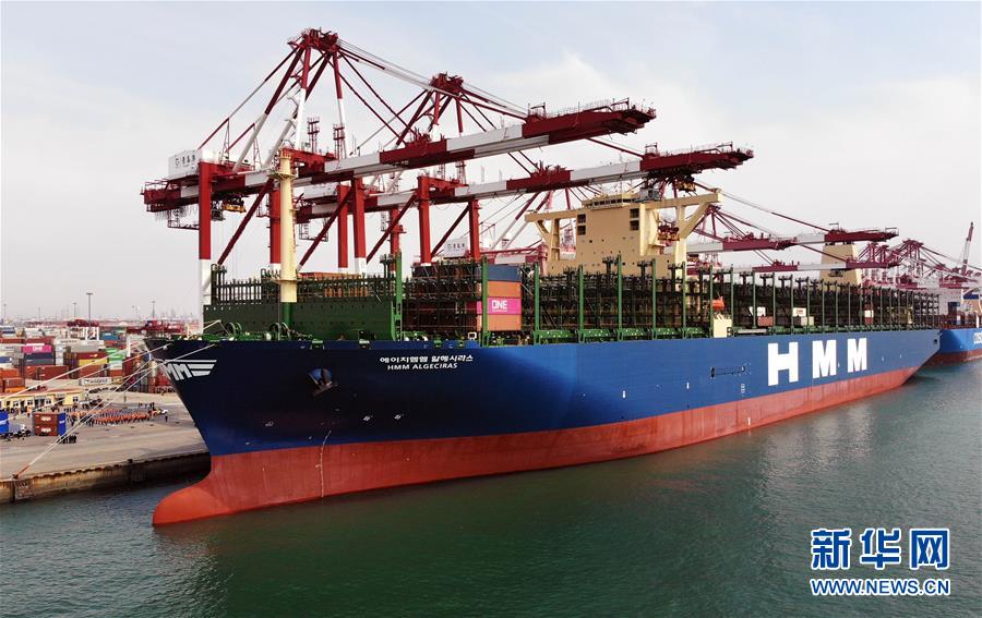 “現(xiàn)代商船阿爾赫西拉斯”輪靠泊在青島港前灣碼頭(無(wú)人機(jī)照片,4月26日攝)。當(dāng)日,載箱量可達(dá)2.4萬(wàn)標(biāo)準(zhǔn)箱的世界最大集裝箱船“現(xiàn)代商船阿爾赫西拉斯”輪從山東青島港開(kāi)啟首航,這條船的甲板面積超過(guò)2.4萬(wàn)平方米,相當(dāng)于3.5個(gè)標(biāo)準(zhǔn)足球場(chǎng)大小。新華社記者李紫恒攝