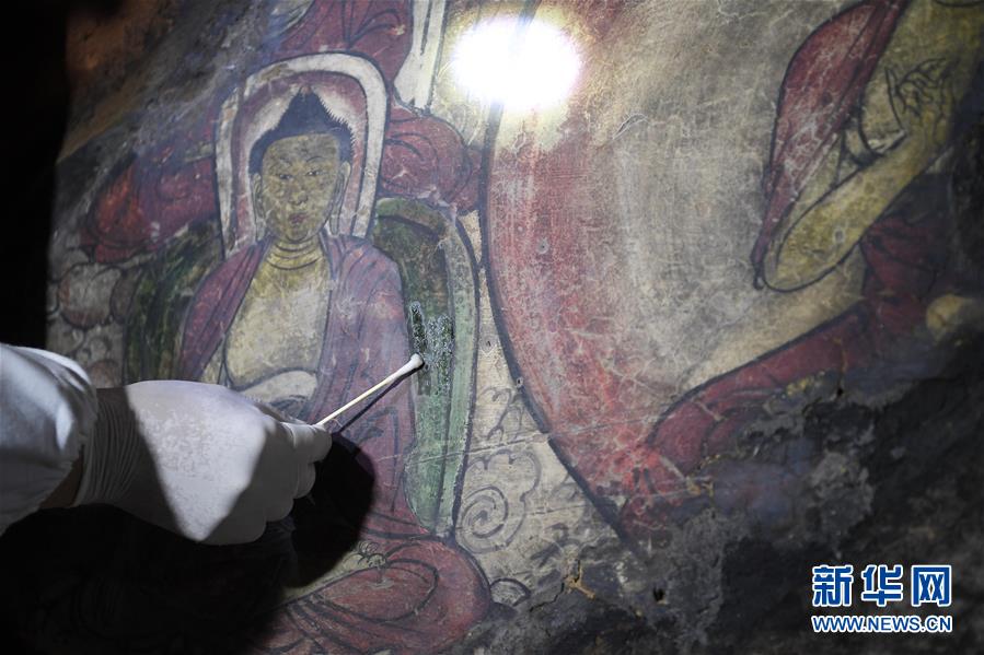 4月27日,文物修復(fù)專家在寧夏須彌山石窟圓光寺48號(hào)窟內(nèi)修復(fù)壁畫。新華社記者馮開華攝