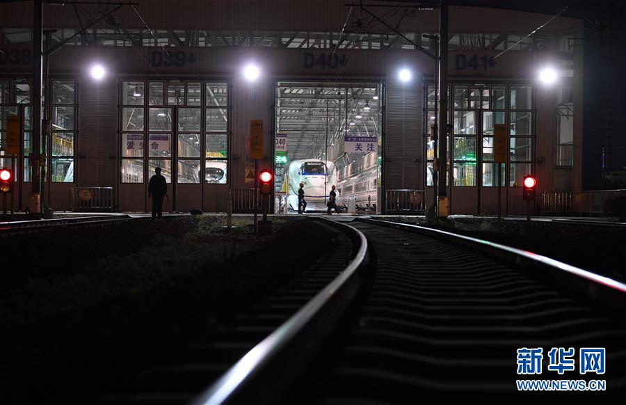 4月29日夜,合肥南動(dòng)車運(yùn)用所的工作人員對動(dòng)車組進(jìn)行檢修。每當(dāng)夜深人靜的時(shí)候,合肥南動(dòng)車運(yùn)用所卻燈火通明,“動(dòng)車安全守護(hù)者”們堅(jiān)守崗位,對動(dòng)車組進(jìn)行全面細(xì)致檢修。新華社記者 劉軍喜 攝