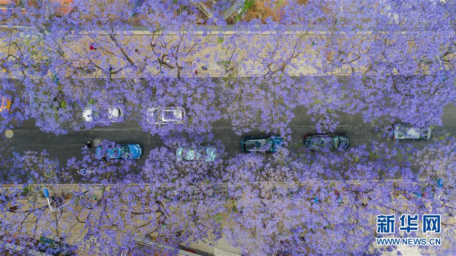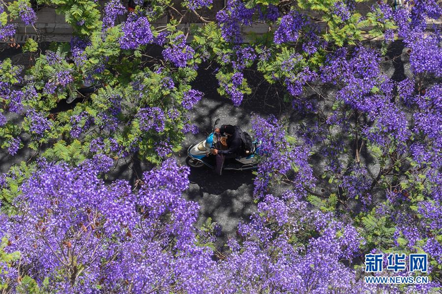 這是5月2日在昆明市桃源街拍攝的藍花楹。近日,云南省昆明市部分街區(qū)的藍花楹競相開放,為春城增添靚麗風景。新華社記者藺以光攝