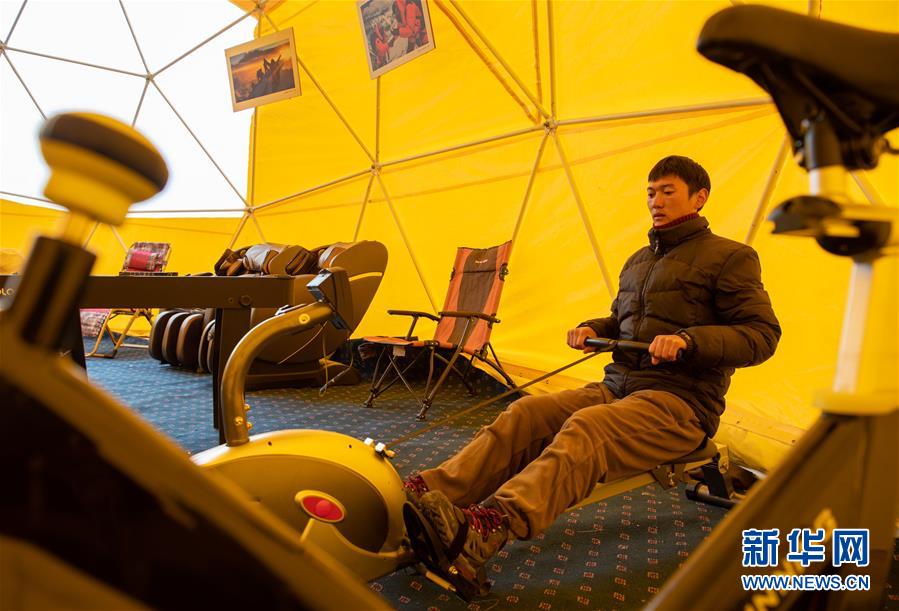 登山隊(duì)員在珠峰大本營(yíng)內(nèi)健身(5月1日攝)。新華社記者晉美多吉攝
