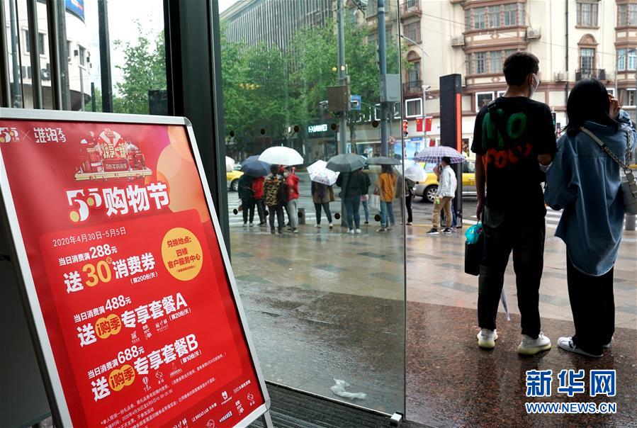 上海一家商場布置的“五五購物節(jié)”標(biāo)識(5月5日攝)。5月4日晚,上海首次啟動大規(guī)模商業(yè)促銷活動“五五購物節(jié)”,多家在線新經(jīng)濟企業(yè)參與,通過線上流量優(yōu)勢反哺線下賣場,實現(xiàn)電商與實體零售融合互動,激活消費潛力、驅(qū)動消費復(fù)蘇。據(jù)“上海發(fā)布”的消息,截至5日14時12分,“五五購物節(jié)”上海地區(qū)消費支付總額已超100億元。新華社記者劉穎攝