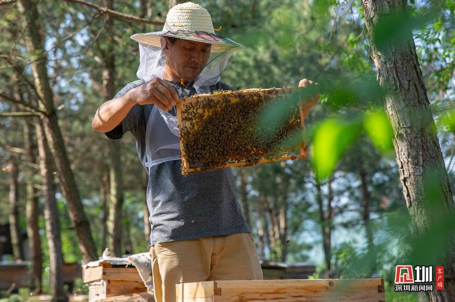 2020年5月3日,湖北省襄陽(yáng)市,在南漳三道河水庫(kù)小島上,小島養(yǎng)蜂人趙德海每天要巡視蜂箱,查看蜂箱的蜜蜂密集度和蜜蜂繁殖情況,及時(shí)調(diào)整,才能避免蜜蜂受損。
