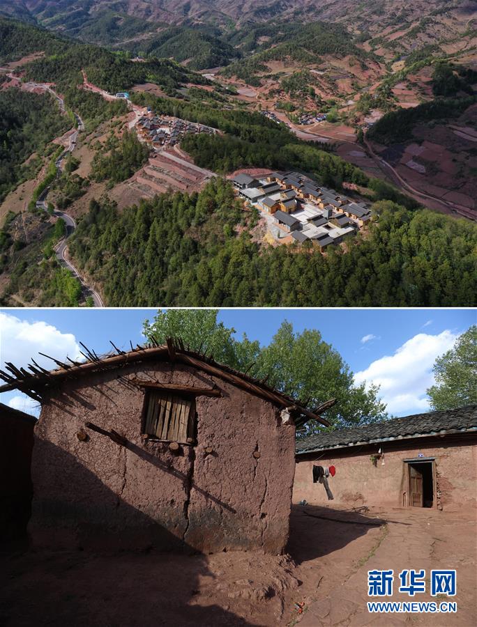 這是一張拼版照片,上圖為:昭覺縣三岔河鄉(xiāng)三河村一個易地扶貧安置點(diǎn)(2020年4月20日攝,無人機(jī)照片);下圖為:昭覺縣三岔河鄉(xiāng)三河村村民原來居住的土坯房(2020年4月20日攝)。新華社記者江宏景攝
