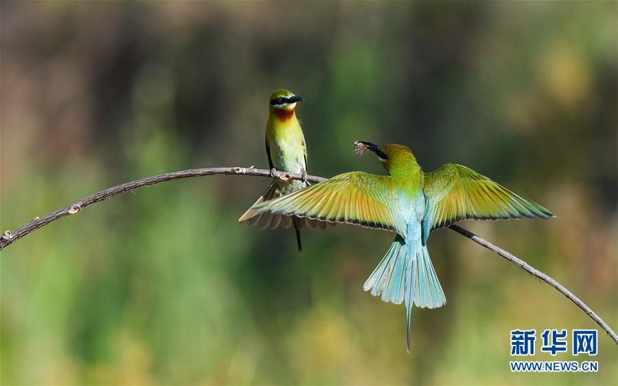 在??谖逶春酉掠畏浠⒈Wo小區(qū),栗喉蜂虎在嬉戲(5月7日攝)。新華社記者楊冠宇攝