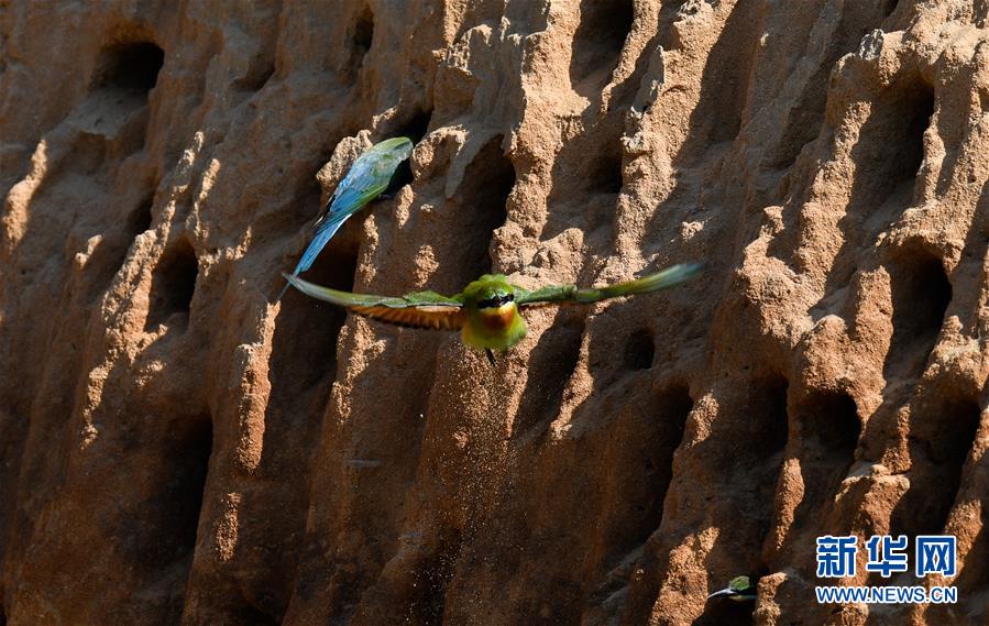 在??谖逶春酉掠畏浠⒈Wo小區(qū),栗喉蜂虎在沙質土坡上起飛(5月7日攝)。新華社記者楊冠宇攝