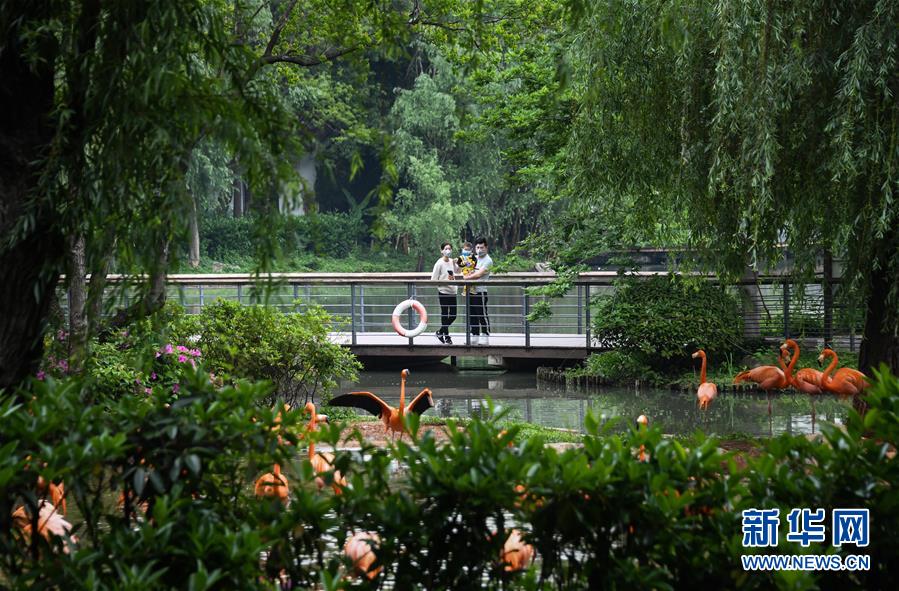 游客在武漢動(dòng)物園觀看火烈鳥(4月22日攝)。 新華社記者 程敏 攝