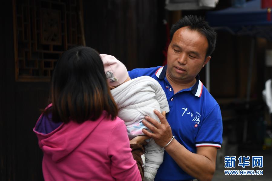 施六金(右)從妻子手中接過兒子施澤恩(4月25日攝)。1973年出生于十八洞村的施六金,由于父親患病很早就放棄學(xué)業(yè)和母親扛起了家庭的重?fù)?dān)。為了生活,他還曾遠(yuǎn)去東南亞打工。2015年,看到家鄉(xiāng)的變化,施六金回到村里開起了農(nóng)家樂,年度家庭人均純收入也從2014年的1715元增長到了2019年的35696元。2018年,施六金與心愛的人組建了家庭。今年初,施六金與愛人迎來了一個大胖小子。“做人做事要懂得回報和感恩?!笔┝鸾o剛出生的兒子取名施澤恩。新華社記者薛宇舸攝