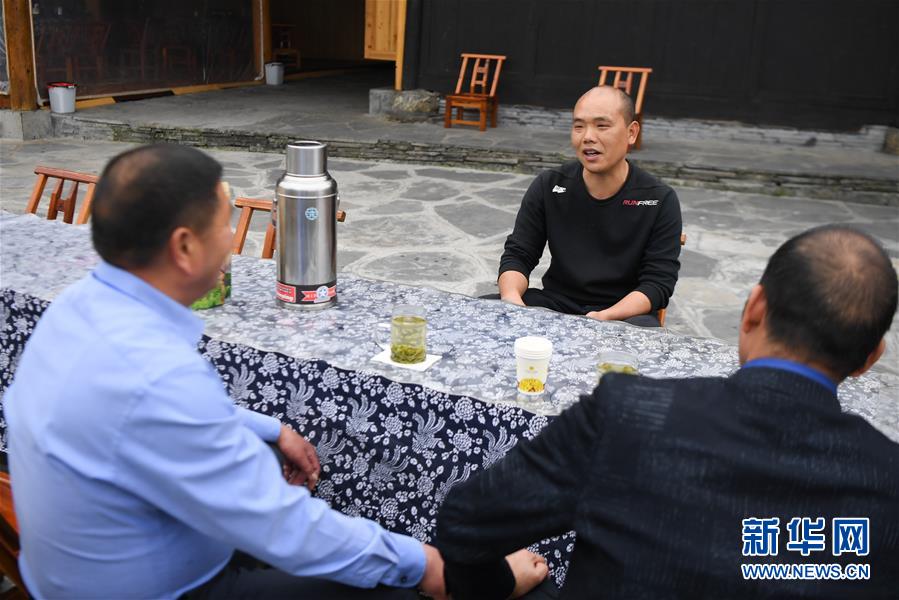 楊正邦(中)在和來自浙江的住客攀談(4月25日攝)。楊正邦1978年出生于十八洞村,在外打工多年。近些年,眼看來十八洞村的游客越來越多,村里越來越熱鬧,楊正邦在2017年結束自己的打工生涯回鄉(xiāng)發(fā)展。他先是在村里擺起小吃攤,2018年開起農家樂,去年又搭起新房子擴建成民宿,年度家庭人均純收入從2014年的1923元增加到2019年的7173元。新華社記者薛宇舸攝