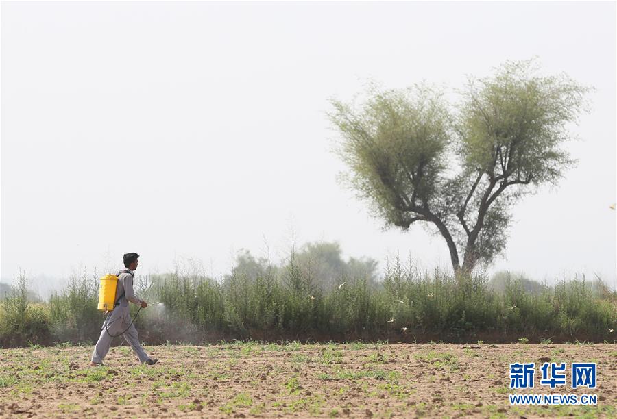 5月9日,在巴基斯坦旁遮普省杰格瓦爾地區(qū),一名工作人員在田間噴灑滅蟲(chóng)劑。據(jù)巴基斯坦媒體報(bào)道,該國(guó)旁遮普省和信德省一些地區(qū)近期再次遭遇沙漠蝗蟲(chóng)侵襲,當(dāng)?shù)卣呀M織民眾進(jìn)行緊急消殺。新華社記者 劉天 攝