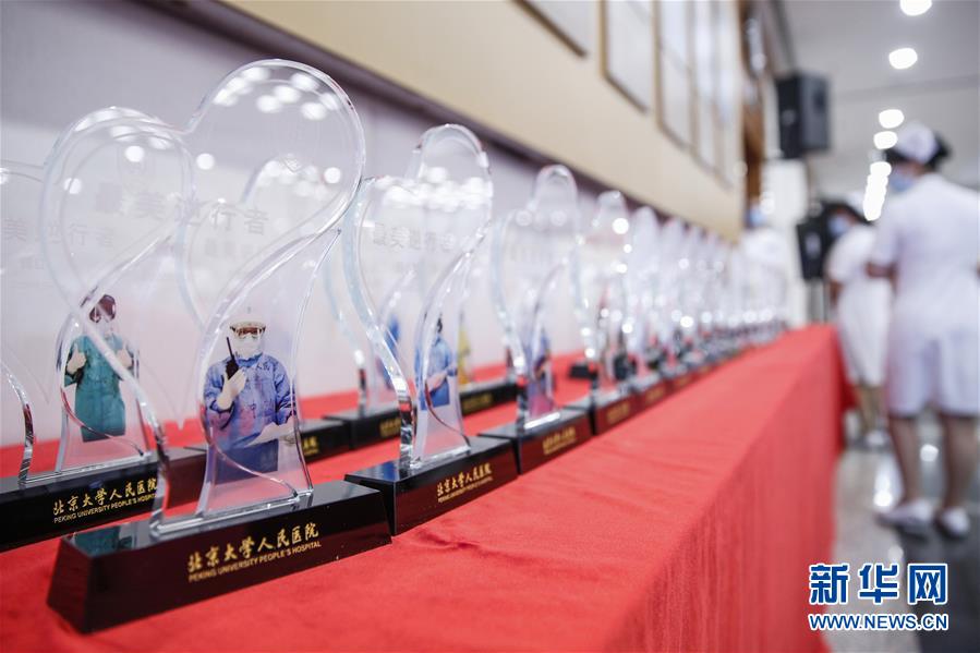 5月11日,工作人員整理印有援鄂隊員工作照的獎杯。在國際護士節(jié)到來之際,北京大學人民醫(yī)院11日舉辦慶祝護士節(jié)暨優(yōu)秀集體和個人表彰活動,并邀請援鄂醫(yī)療隊護士代表分享戰(zhàn)“疫”故事。我國今年護士節(jié)的主題為“致敬護士隊伍,攜手戰(zhàn)勝疫情”。新華社記者張玉薇攝