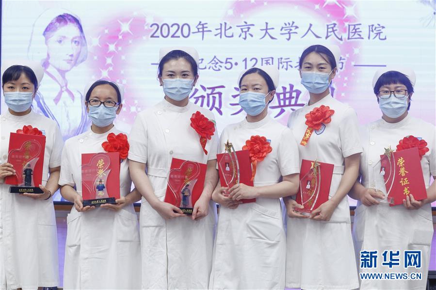 5月11日,獲獎護(hù)士在護(hù)士節(jié)活動上合影。在國際護(hù)士節(jié)到來之際,北京大學(xué)人民醫(yī)院11日舉辦慶祝護(hù)士節(jié)暨優(yōu)秀集體和個(gè)人表彰活動,并邀請?jiān)踽t(yī)療隊(duì)護(hù)士代表分享戰(zhàn)“疫”故事。我國今年護(hù)士節(jié)的主題為“致敬護(hù)士隊(duì)伍,攜手戰(zhàn)勝疫情”。新華社記者張玉薇攝